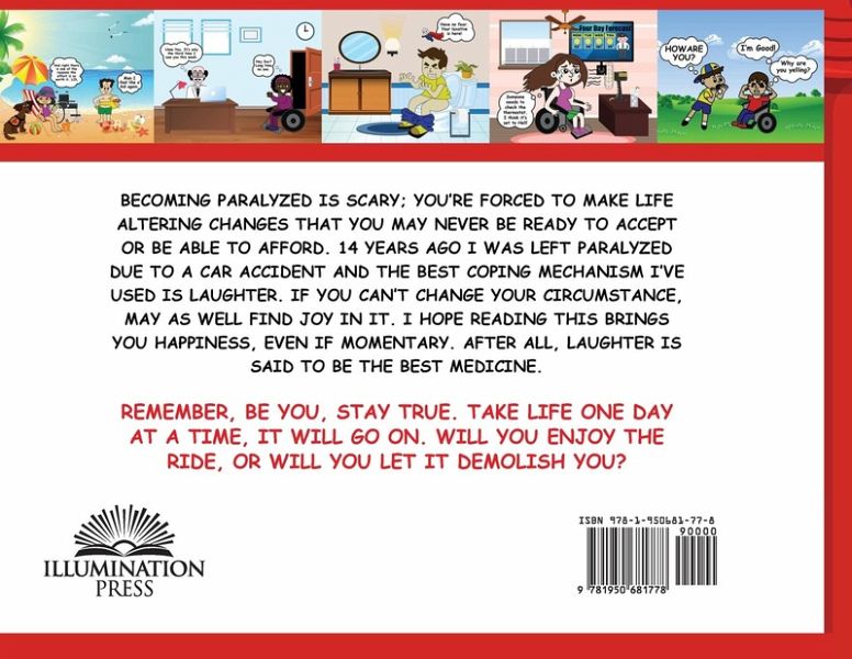 Becoming paralyzed is scary; you're forced to make life altering changes that you may never be ready to accept or be able to afford. Fourteen years ago, I was left paralyzed due to a car accident and the best coping mechanism I've used is laughter. If you can't change your circumstance, may as well find joy in it. I hope reading this brings you happiness, even if momentary. After all, laughter is said to be the best medicine. Remember, be you, stay true. Take life one day at a time, it will go on. Will you enjoy the ride, or will you let it demolish you?