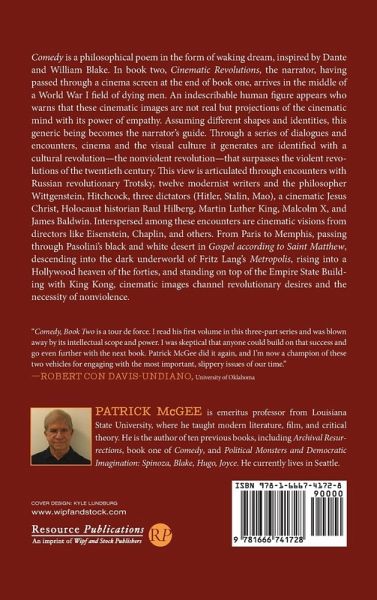 Comedy is a philosophical poem in the form of waking dream, inspired by Dante and William Blake. In book two, Cinematic Revolutions, the narrator, having passed through a cinema screen at the end of book one, arrives in the middle of a World War I field of dying men. An indescribable human figure appears who warns that these cinematic images are not real but projections of the cinematic mind with its power of empathy. Assuming different shapes and identities, this generic being becomes the narrator's guide. Through a series of dialogues and encounters, cinema and the visual culture it generates are identified with a cultural revolution--the nonviolent revolution--that surpasses the violent revolutions of the twentieth century. This view is articulated through encounters with Russian revolutionary Trotsky, twelve modernist writers and the philosopher Wittgenstein, Hitchcock, three dictators (Hitler, Stalin, Mao), a cinematic Jesus Christ, Holocaust historian Raul Hilberg, Martin Luther King, Malcolm X, and James Baldwin. Interspersed among these encounters are cinematic visions from directors like Eisenstein, Chaplin, and others. From Paris to Memphis, passing through Pasolini's black and white desert in Gospel according to Saint Matthew, descending into the dark underworld of Fritz Lang's Metropolis, rising into a Hollywood heaven of the forties, and standing on top of the Empire State Building with King Kong, cinematic images channel revolutionary desires and the necessity of nonviolence.