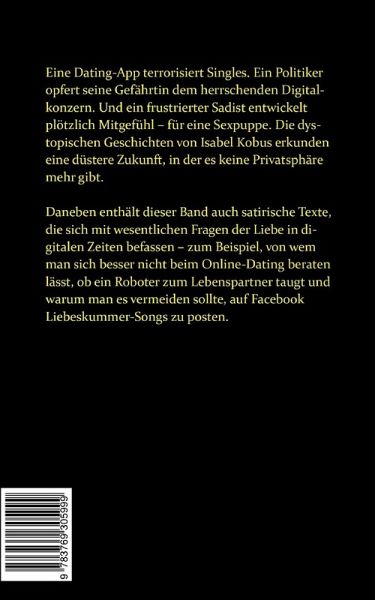 Eine Dating-App terrorisiert Singles. Ein Politiker opfert seine Gefährtin dem alles beherrschenden Digitalkonzern. Und ein frustrierter Sadist entwickelt plötzlich Mitgefühl -- für eine Sexpuppe. Die dystopischen Geschichten von Isabel Kobus erkunden eine düstere Zukunft, in der es keine Privatsphäre mehr gibt. Daneben enthält dieser Band auch satirische Texte, die sich mit wesentlichen Fragen der Liebe in digitalen Zeiten befassen. Zum Beispiel, von wem man sich besser nicht beim Online-Dating beraten lässt, ob ein Roboter zum Lebenspartner taugt und warum man es vermeiden sollte, auf Facebook Liebeskummer-Songs zu posten.