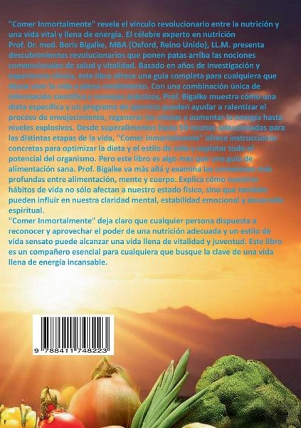 "Comer Inmortalmente" revela el vínculo revolucionario entre la nutrición y una vida vital y llena de energía. El célebre experto en nutrición Prof. Dr. med. Boris Bigalke, MBA (Oxford, Reino Unido), LL.M. presenta descubrimientos revolucionarios que ponen patas arriba las nociones convencionales de salud y vitalidad. Basado en años de investigación y experiencia clínica, este libro ofrece una guía completa para cualquiera que desee vivir la vida a pleno rendimiento. Con una combinación única de información científica y consejos prácticos, Prof. Bigalke muestra cómo una dieta específica y un programa de ejercicio pueden ayudar a ralentizar el proceso de envejecimiento, regenerar las células y aumentar la energía hasta niveles explosivos. Desde superalimentos hasta 50 recetas seleccionadas para las distintas etapas de la vida, "Comer inmortalmente" ofrece instrucciones concretas para optimizar la dieta y el estilo de vida y explotar todo el potencial del organismo. Pero este libro es algo más que una guía de alimentación sana. Prof. Bigalke va más allá y examina las conexiones más profundas entre alimentación, mente y cuerpo. Explica cómo nuestros hábitos de vida no sólo afectan a nuestro estado físico, sino que también pueden influir en nuestra claridad mental, estabilidad emocional y desarrollo espiritual. "Comer Inmortalmente" deja claro que cualquier persona dispuesta a reconocer y aprovechar el poder de una nutrición adecuada y un estilo de vida sensato puede alcanzar una vida llena de vitalidad y juventud. Este libro es un compañero esencial para cualquiera que busque la clave de una vida llena de energía incansable.