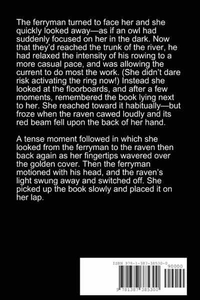 The ferryman turned to face her and she quickly looked away-as if an owl had suddenly focused on her in the dark. Now that they'd reached the trunk of the river, he had relaxed the intensity of his rowing to a more casual pace, and was allowing the current to do most the work. (She didn't dare risk activating the ring now!) Instead she looked at the floorboards, and after a few moments, remembered the book lying next to her. She reached toward it habitually-but froze when the raven cawed loudly and its red beam fell upon the back of her hand. A tense moment followed in which she looked from…mehr
