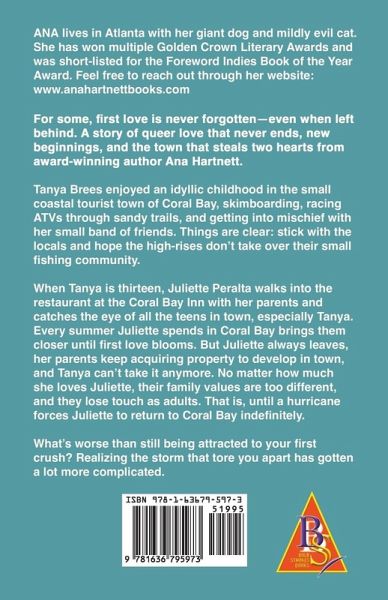 For some, first love is never forgotten--even when left behind. A story of queer love that never ends, new beginnings, and the town that steals two hearts from award-winning author Ana Hartnett. Tanya Brees enjoyed an idyllic childhood in the small coastal tourist town of Coral Bay, skimboarding, racing ATVs through sandy trails, and getting into mischief with her small band of friends. Things are clear: stick with the locals and hope the high-rises don't take over their small fishing community. When Tanya is thirteen, Juliette Peralta walks into the restaurant at the Coral Bay Inn with her parents and catches the eye of all the teens in town, especially Tanya. Every summer Juliette spends in Coral Bay brings them closer until first love blooms. But Juliette always leaves, her parents keep acquiring property to develop in town, and Tanya can't take it anymore. No matter how much she loves Juliette, their family values are too different, and they lose touch as adults. That is, until a hurricane forces Juliette to return to Coral Bay indefinitely. What's worse than still being attracted to your first crush? Realizing the storm that tore you apart has gotten a lot more complicated.