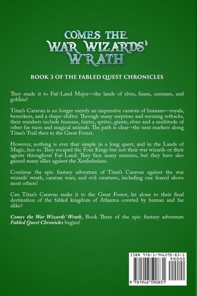 Book Three of the Fabled Quest Chronicles is here! COMES THE WAR WIZARDS’ WRATH! They made it to Faë-Land Major—the lands of elves, fauns, centaurs, and goblins! Titan’s Caravan is no longer merely an impressive caravan of humans—royals, berserkers, and a shape-shifter. Through many surprises and seeming setbacks, their numbers include humans, fairies, sprites, giants, elves and a multitude of other fae races and magical animals. The path is clear--the next markers along Titan’s Trail then to the Great Forest. However, nothing is ever that simple in a long quest, and in the Lands of Magic, less so. They escaped the Four Kings but not their war wizards or their agents throughout Faë-Land. They face many enemies, but they have also gained many allies against the Xenhelmians. Continue the epic fantasy adventure of Titan’s Caravan against the war wizards’ wrath, caravan wars, and evil creatures, including one feared above most others! Can Titan’s Caravan make it to the Great Forest, let alone to their final destination of the fabled kingdom of Atlantea coveted by human and fae alike?