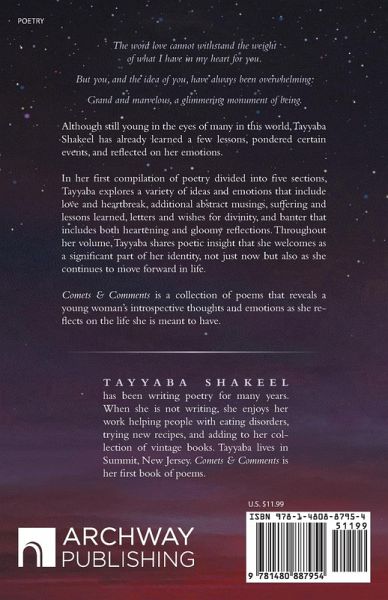 The word love cannot withstand the weight of what I have in my heart for you. But you, and the idea of you, have always been overwhelming: Grand and marvelous, a glimmering monument of being. Although still young in the eyes of many in this world, Tayyaba Shakeel has already learned a few lessons, pondered certain events, and reflected on her emotions. In her first compilation of poetry divided into five sections, Tayyaba explores a variety of ideas and emotions that include love and heartbreak, additional abstract musings, suffering and lessons learned, letters and wishes for divinity, and banter that includes both heartening and gloomy reflections. Throughout her volume, Tayyaba shares poetic insight that she welcomes as a significant part of her identity, not just now but also as she continues to move forward in life. Comets & Comments is a collection of poems that reveals a young woman's introspective thoughts and emotions as she reflects on the life she is meant to have.