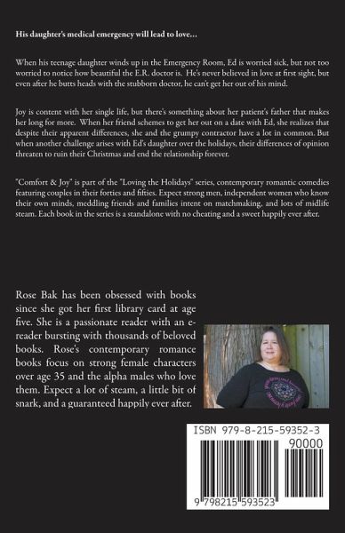 His daughter's medical emergency will lead to love… When his teenage daughter winds up in the Emergency Room, Ed is worried sick, but not too worried to notice how beautiful the E.R. doctor is. He's never believed in love at first sight, but even after he butts heads with the stubborn doctor, he can't get her out of his mind. Joy is content with her single life, but there's something about her patient's father that makes her long for more. When her friend schemes to get her out on a date with Ed, she realizes that despite their apparent differences, she and the grumpy contractor have a lot in common. But when another challenge arises with Ed's daughter over the holidays, their differences of opinion threaten to ruin their Christmas and end the relationship forever. "Comfort & Joy" is part of the "Loving the Holidays" series, contemporary romantic comedies featuring couples in their forties and fifties. Expect strong men, independent women who know their own minds, meddling friends and families intent on matchmaking, and lots of midlife steam. Each book in the series is a standalone with no cheating and a sweet happily ever after.