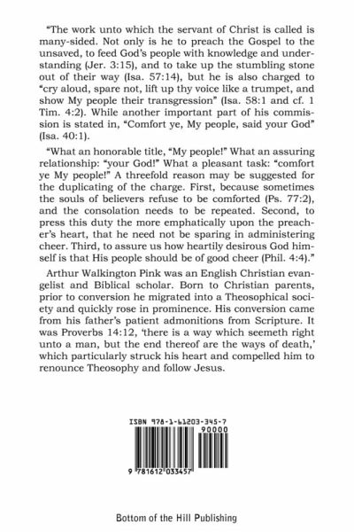 "The work unto which the servant of Christ is called is many-sided. Not only is he to preach the Gospel to the unsaved, to feed God's people with knowledge and understanding (Jer. 3:15), and to take up the stumbling stone out of their way (Isa. 57:14), but he is also charged to "cry aloud, spare not, lift up thy voice like a trumpet, and show My people their transgression" (Isa. 58:1 and cf. 1 Tim. 4:2). While another important part of his commission is stated in, "Comfort ye, My people, said your God" (Isa. 40:1). "What an honorable title, "My people!" What an assuring relationship: "your God!" What a pleasant task: "comfort ye My people!" A threefold reason may be suggested for the duplicating of the charge. First, because sometimes the souls of believers refuse to be comforted (Ps. 77:2), and the consolation needs to be repeated. Second, to press this duty the more emphatically upon the preacher's heart, that he need not be sparing in administering cheer. Third, to assure us how heartily desirous God himself is that His people should be of good cheer (Phil. 4:4)." Arthur Walkington Pink was an English Christian evangelist and Biblical scholar. Born to Christian parents, prior to conversion he migrated into a Theosophical society and quickly rose in prominence. His conversion came from his father's patient admonitions from Scripture. It was Proverbs 14:12, 'there is a way which seemeth right unto a man, but the end thereof are the ways of death,' which particularly struck his heart and compelled him to renounce Theosophy and follow Jesus.