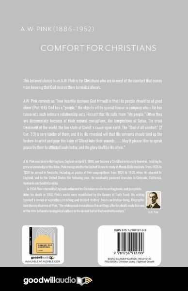 Comfort for Christians by A.W. Pink (1886-1952) This beloved classic from A.W. Pink is for the spiritually unhappy and discontented in need of comfort and assurance that God desires them to rejoice always. A.W. Pink reminds us "how heartily desirous God himself is that His people should be of good cheer (Phil 4:4). God has a "people," the objects of His special favour: a company whom He has taken into such intimate relationship unto Himself that He calls them "My people." Often they are disconsolate: because of their natural corruptions, the temptations of Satan, the cruel treatment of the world, the low state of Christ's cause upon earth. The "God of all comfort" (2 Cor 1:3) is very tender of them, and it is His revealed will that His servants should bind up the broken-hearted and pour the balm of Gilead into their wounds ... May it please Him to speak peace by them to afflicted souls today, and the glory shall be His alone."