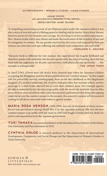 From Comfort Woman: "We began the day with breakfast, after which we swept and cleaned our rooms. Then we went to the bathroom downstairs to wash the only dress we had and to bathe. The bathroom did not even have a door, so the soldiers watched us. We were all naked, and they laughed at us, especially me and the other young girl who did not have any pubic hair. "At two, the soldiers came. My work began, and I lay down as one by one the soldiers raped me. Every day, anywhere from twelve to over twenty soldiers assaulted me. There were times when there were as many as thirty; they came to the garrison in truckloads." "I lay on the bed with my knees up and my feet on the mat, as if I were giving birth. Whenever the soldiers did not feel satisfied, they vented their anger on me. Every day, there were incidents of violence and humiliation. When the soldiers raped me, I felt like a pig. Sometimes they tied up my right leg with a waist band or a belt and hung it on a nail in the wall as they violated me. "I shook all over. I felt my blood turn white. I heard that there was a group called the Task Force on Filipino Comfort Women looking for women like me. I could not forget the words that blared out of the radio that day: 'Don't be ashamed, being a sex slave is not your fault. It is the responsibility of the Japanese Imperial Army. Stand up and fight for your rights.'" In April 1943, fifteen-year-old Maria Rosa Henson was taken by Japanese soldiers occupying the Philippines and forced into prostitution as a "comfort woman." In this simply told yet powerfully moving autobiography, Rosa recalls her childhood as the illegitimate daughter of a wealthy landowner, her work for Huk guerrillas, her wartime ordeal, and her marriage to a rebel leader who left her to raise their children alone. Her triumph against all odds is embodied by her decision to go public with the secret she had held close for fifty years. Now in a second edition with a new introduction and foreword that bring the ongoing controversy over the comfort women to the present, this powerful memoir will be essential reading for all those concerned with violence against women.