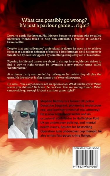 There's a killer lurking in all of us. Sometimes you just don't know it. Take Phil Mercer, for example, what dark secret from his past changes a decent man, and respected professional into a man with murder on his mind? Down to earth Northerner, Phil Mercer, begins to question why so-called university friends failed to help him establish a practice at London's Criminal Bar. Despite that and colleagues' professional jealousy, he goes on to achieve success as a fearless defender of society's less fortunate until his career is threatened by events triggered by something completely out of his control. Figuring his life and career are about to change forever, Mercer strives to find a way to right wrongs by inventing a new parlour game called 'Comfort Zone.' At a dinner party surrounded by colleagues he insists they all play the game. He introduces it after dinner as a 'storytelling game.' He adds - "the easy choice is not an option at all. What terrifies you? What scares you shitless? Be brave. Be reckless. You are among friends. What can possibly go wrong? It's just a parlour game, right?" Get this dark suspense noir crime novella now.