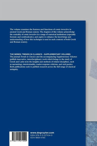 This volume acknowledges the centrality of comic invective in a range of oratorical institutions (especially forensic and symbouleutic), and aspires to enhance the knowledge and understanding of how this technique is used in such con-texts of both Greek and Roman oratory. Despite the important scholarly work that has been done in discussing the patterns of using invective in Greek and Roman texts and contexts, there are still notable gaps in our knowledge of the issue. The introduction to, and the twelve chapters of, this volume address some understudied multi-genre and interdisciplinary topics: first, the ways in which comic invective in oratory draws on, or has implications for, comedy and other genres, or how these literary genres are influenced by oratorical theory and practice, and by contemporary socio-political circumstances, in articulating comic invective and targeting prominent individuals; second, how comic invective sustains relationships and promotes persuasion through unity and division; third, how it connects with sexuality, the human body and male/female physiology; fourth, what impact generic dichotomies, as, for example, public-private and defence-prosecution, may have upon using comic invective; and fifth, what the limitations in its use are, depending on the codes of honour and decency in ancient Greece and Rome.
