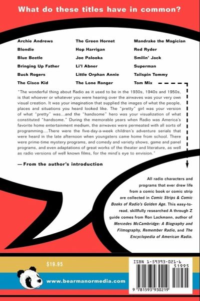 From Archie Andrews to Tom Mix, all radio characters and programs that ever stemmed from a comic book or comic strip in radio's golden age are collected here, for the first time, in an easy-to-read, A through Z book! From Ron's introduction: "The wonderful thing about Radio as it used to be in the 1930s, 1940s and 1950s, is that whoever or whatever you were hearing over the airwaves was your very own visual creation. It was your imagination that supplied the images of what the people, places and situations you heard looked like. The "pretty" girl was your version of what "pretty" was… and the "handsome" hero was your visualization of what constituted "handsome." During the memorable years when Radio was America's favorite home entertainment medium, the airwaves were permeated with all sorts of programming. There were the daytime dramas of domestic stress, or soap operas as they were called because they were usually sponsored by soap detergent companies, that at-home moms and night-working dads could tune in to hear and sometimes their sick-at-home--with-a-cold kids also listened to "the soaps." There were the five-day-a-week children's adventure serials that were heard in the late afternoon when youngsters came home from school. There were prime-time mystery programs, and comedy and variety shows, game and panel programs, and even adaptations of great works of the theater and literature, as well as radio versions of well known films, for the mind's eye to envision."