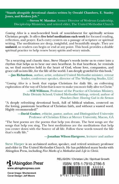 A spiritual practice for serious-minded (but busy) people. Everyone needs renewal, even the most committed among us. The spiritual life requires regular practice and a bit of time. Coming Alive: Daily Meditations for Spiritual Renewal offers five brief meditations each week for focused reading, reflection, and prayer. Each entry centers on a passage of scripture or spiritual writing. The meditations are deep, insightful, and beautifully simple, as readers have come to expect from Steve Harper's writing. This timeless book offers a gently challenging daily habit, which leads to renewal of spirit and mind. Coming Alive features - Brief readings, about 10 minutes per day - Undated readings, so readers can determine their own pattern of practice - Spiritual depth and wisdom from ancient and contemporary sources - Foreword by Brian McLaren From the Foreword: "Steve Harper's new book beautifully focuses in on the real core of the spiritual life: Not dogma, not rules and regulations, not duties or guilt, not pressure or obligation ... but life, life to the full, what I like to call aliveness." --Brian McLaren