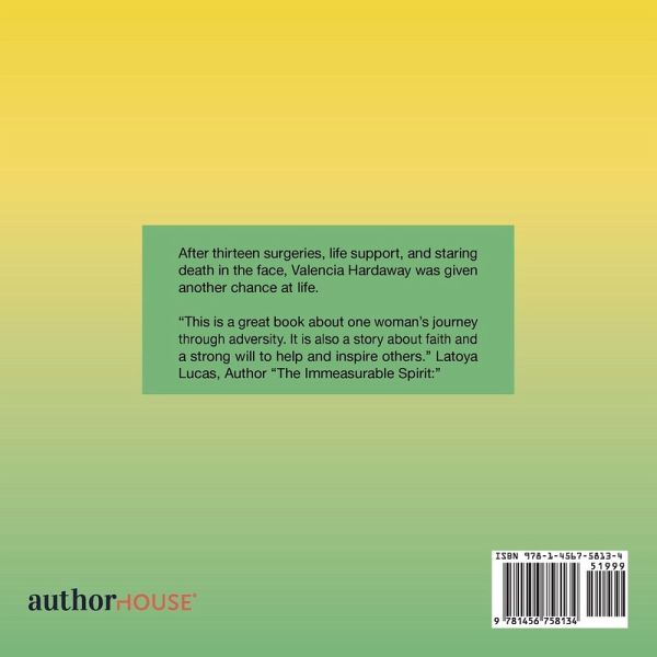 After thirteen surgeries, life support, and staring death in the face, Valencia Hardaway was given another chance at life. "This is a great book about one woman's journey through adversity. It is also a story about faith and a strong will to help and inspire others." Latoya Lucas, Author "The Immeasurable Spirit:"