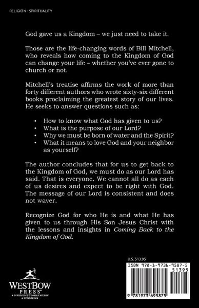 God gave us a Kingdom - we just need to take it. Those are the life-changing words of Bill Mitchell, who reveals how coming to the Kingdom of God can change your life - whether you've ever gone to church or not. Mitchell's treatise affirms the work of more than forty different authors who wrote sixty-six different books proclaiming the greatest story of our lives. He seeks to answer questions such as: How to know what God has given to us? What is the purpose of our Lord? Why we must be born of water and the Spirit? What it means to love God and your neighbor as yourself? The author concludes that for us to get back to the Kingdom of God, we must do as our Lord has said. That is everyone. We cannot all do as each of us desires and expect to be right with God. The message of our Lord is consistent and does not waver. Recognize God for who He is and what He has given to us through His Son Jesus Christ with the lessons and insights in Coming Back to the Kingdom of God.