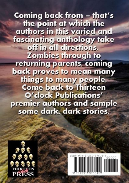 Coming back from - that's the point at which the authors in this varied and fascinating anthology take off in all directions. Zombies through to returning parents, coming back proves to mean many things to many people. Come back to Thirteen O'clock Publications' premier authors and sample some dark, dark stories.