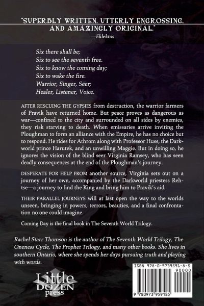 The last enemy is Death in this classic Christian fantasy. Six there shall be; Six to see the seventh free. Six to know the coming day; Six to wake the fire. After rescuing the Gypsies from destruction, the warrior farmers of Pravik have returned home. But peace proves as dangerous as war-confined to the city and surrounded on all sides, they risk starving to death. When emissaries arrive inviting the Ploughman to form an alliance with the Empire, he rides for Athrom. But in doing so, he ignores the vision of the blind seer Virginia Ramsey, who has seen deadly consequences at the end of his journey. Desperate for help from another source, Virginia sets out on a journey of her own, accompanied by the Darkworld priestess Rehtse-a journey to find the King and bring him to Pravik's aid. Their parallel journeys will at last open the way to the worlds unseen, bringing in powers, terrors, beauties, and a final confrontation no one could imagine. COMING DAY is the last book in The Seventh World Trilogy, a Christian fantasy adventure with hints of steampunk and depths of spiritual truth. If you love page-turning action, memorable characters, and inspirational fiction that confronts darkness, reveals breathtaking beauty, and moves your heart to connect more deeply with God, this series is for you.