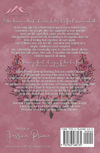 She knew what it was like to feel unwanted. At an early age Eliza Anderson learned a very hard lesson. Sometimes the people who are supposed to love you the most are the ones that cause you the most pain. She learned to guard herself, hesitating to let anyone close for fear of feeling that rejection all over again. Then Ethan came into her life, and what had started as a simple childhood crush morphed into a friendship she eventually came to cherish above all else. He was her safe place. Her rock. A shoulder she could lean on. Until he ripped it all away. He knew what it was like to feel like an outsider. Ethan Prewitt grew up learning that you couldn't always trust the people you loved the most to be there. That sense of security he craved had always alluded him, leaving him to feel like an interloper in his own home. He dreamed of escaping the small town of Pembrooke and building a life where he didn't have to depend on anyone but himself. What he never expected was for his friendship with Eliza to grow into something that meant everything to him. Mistakes were made. Hearts were broken. But now Ethan's home and he's determined to make it right. It was time for their relationship to come full circle. Because what they had was once in a lifetime.