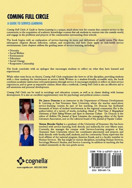 Coming Full Circle: A Guide to Service-Learning is a unique, stand-alone text for courses that connect service to the community to the acquisition of academic knowledge¿courses that ask students to venture into the outside world, and engage in the problems and projects of the communities surrounding their schools. The book begins with an explanation of service-learning, its roots, and definitions of useful terms. The three subsequent chapters discuss reflection, culture, and reciprocity, and how these apply to real-world service environments. Later chapters address the guiding issues of service-learning, including: - Diversity - Social Welfare - Environment - Education - Social Change - Responsive Citizenship The book concludes with an epilogue that encourages students to reflect on what they have learned and experienced. While other texts focus on theory, Coming Full Circle emphasizes the how-to of the discipline, providing students with a clear roadmap for involvement in service fields. Written in a student-friendly, accessible style, the book combines academic instruction with participation through service. It encourages students to reflect on their service experiences, and to grow as responsive citizens. More than a textbook, Coming Full Circle is also an effective aid to self-awareness and personal development. Coming Full Circle can be used in sociology and education courses, as well as in classes dealing with human development. It is also an excellent supplementary text for psychology and political science courses. Dr. Joyce Duncan is an instructor in the Department of Human Development & Learning at East Tennessee State University, where she teaches stand-alone service-learning courses. As part of her teaching, Dr. Duncan has facilitated thousands of hours of student involvement in the regional community. She is the author/editor of a variety of works, including Ahead of Their Time: A Biographical Dictionary of Risk-Taking Women and Sport in American Culture. Dr. Duncan is the editor of Aethlon: The Journal of Sport Literature, the managing editor of the Sport Literature Association, and on the editorial board of the Journal of Popular Culture. Teresa Brooks Taylor is a graduate of the University of Tennessee. She has been involved with service-learning, both directly and indirectly, for over fifteen years. Currently, she manages the campus wide Service-Learning program at East Tennessee State University, where she coordinates placements and projects, and deals directly with faculty, staff, students, and the community. Teresa supervises the local affiliate of the national program, America Reads, and is a faculty member in Human Services. She has taught in various disciplines, including Human Services, Sociology, Women¿s Studies, and Service-Learning. In addition to teaching, she has worked extensively in the non-profit sector.
