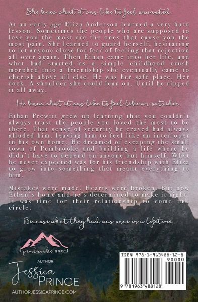 At an early age Eliza Anderson learned a very hard lesson. Sometimes the people who are supposed to love you the most are the ones that cause you the most pain. She learned to guard herself, hesitating to let anyone close for fear of feeling that rejection all over again. Then Ethan came into her life, and what had started as a simple childhood crush morphed into a friendship she eventually came to cherish above all else. He was her safe place. Her rock. A shoulder she could lean on. Until he ripped it all away. He knew what it was like to feel like an outsider. Ethan Prewitt grew up learning that you couldn't always trust the people you loved the most to be there. That sense of security he craved had always alluded him, leaving him to feel like an interloper in his own home. He dreamed of escaping the small town of Pembrooke and building a life where he didn't have to depend on anyone but himself. What he never expected was for his friendship with Eliza to grow into something that meant everything to him. Mistakes were made. Hearts were broken. But now Ethan's home and he's determined to make it right. It was time for their relationship to come full circle. Because what they had was once in a lifetime.