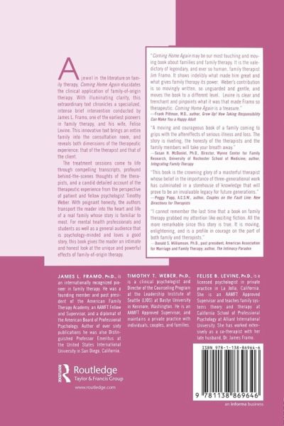 Coming Home Again is a compelling case study a single family that underwent family-of-origin therapy presented by one of the earliest and best-known pioneers in the field. This book is unique in its presentation of the two dimensions of the therapeutic experience-that of the therapist and that of the clients. Framo and Levine serve as the therapy team, while Weber and his family are the clients in these two specialized, intense, brief intervention sessions that occurred one year apart. The transcripts of the sessions are supported by commentary from both therapists as well as insights from Weber-the client-who brings to bear clinical knowledge and knowledge of himself and his family. The underlying story-the story of the therapists-is almost as compelling as the family's story. It is a candid, honest look at family-of-origin therapy from those who partook in the sessions.