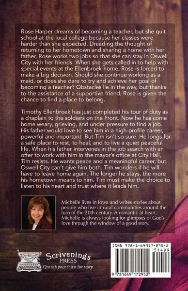 Her college career is cut short, so Rose Harper takes a job that throws her into the path of a weary soldier who joins her in the search of a place to call home. Rose Harper dreams of becoming a teacher, but she quit school at the local college because her classes were harder than she expected. Dreading the thought of returning to her hometown and sharing a home with her father, Rose works two jobs so that she can stay in Oswell City with her friends. When she gets called in to help with special events at the Ellenbroek home, Rose is forced to make a big decision. Should she continue working as a maid, or does she dare to try and achieve her goal of becoming a teacher? Obstacles lie in the way, but thanks to the assistance of a supportive friend, Rose is given the chance to find a place to belong. Timothy Ellenbroek has just completed his tour of duty as a chaplain to the soldiers on the Front. Now he has come home weary, grieving, and under pressure to find a job. His father would love to see him in a high-profile career, powerful and important. But Tim isn't so sure. He longs for a safe place to rest, to heal, and to live a quiet peaceful life. When his father intervenes in the job search with an offer to work with him in the mayor's office at City Hall, Tim resists. He wants peace and a meaningful career, but Oswell City can't give him both. Tim wonders if he will have to leave home again. The longer he stays, the more his hometown means to him. Tim must make the choice to listen to his heart and trust where it leads him.