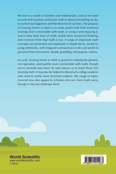 We live in a world of numbers and mathematics, and so we need to work with numbers and some math in almost everything we do, to control our happiness and the direction of our lives. The purpose of Coming Home to Math is to make adults with little technical training more comfortable with math, in using it and enjoying it, and to allay their fears of math, enable their numerical thinking, and convince them that math is fun. A range of important math concepts are presented and explained in simple terms, mostly by using arithmetic, with frequent connections to the real world of personal financial matters, health, gambling, and popular culture. As such, Coming Home to Math is geared to making the general, non-specialist, adult public more comfortable with math, though not to formally train them for new careers or to teach those first learning math. It may also be helpful to liberal arts college students who need to tackle more technical subjects. The range of topics covered may also appeal to scholars who are more math savvy, though it may not challenge them.
