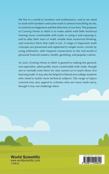 We live in a world of numbers and mathematics, and so we need to work with numbers and some math in almost everything we do, to control our happiness and the direction of our lives. The purpose of Coming Home to Math is to make adults with little technical training more comfortable with math, in using it and enjoying it, and to allay their fears of math, enable their numerical thinking, and convince them that math is fun. A range of important math concepts are presented and explained in simple terms, mostly by using arithmetic, with frequent connections to the real world of personal financial matters, health, gambling, and popular culture. As such, Coming Home to Math is geared to making the general, non-specialist, adult public more comfortable with math, though not to formally train them for new careers or to teach those first learning math. It may also be helpful to liberal arts college students who need to tackle more technical subjects. The range of topics covered may also appeal to scholars who are more math savvy, though it may not challenge them.