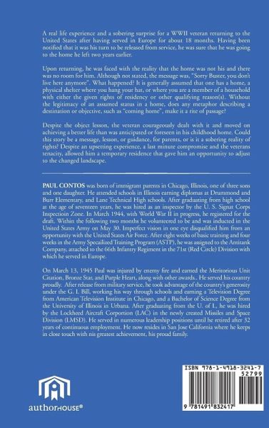 A real life experience and a sobering surprise for a WWII veteran returning to the United States after having served in Europe for about 18 months. Having been notified that it was his turn to be released from service, he was sure that he was going to the home he left two years earlier. Upon returning, he was faced with the reality that the home was not his and there was no room for him. Although not stated, the message was, "Sorry Buster, you don't live here anymore". What happened? It is generally assumed that one has a home, a physical shelter where you hang your hat, or where you are a member of a household with either the given rights of residency or other qualifying reason(s). Without the legitimacy of an assumed status in a home, does any metaphor describing a destination or objective, such as "coming home", make it a rite of passage? Despite the object lesson, the veteran courageously dealt with it and moved on achieving a better life than was anticipated or foreseen in his childhood home. Could this story be a message, lesson, or guidance, for parents, or is it a sobering reality of rights? Despite an upsetting experience, a last minute compromise and the veterans tenacity, allowed him a temporary residence that gave him an opportunity to adjust to the changed landscape.