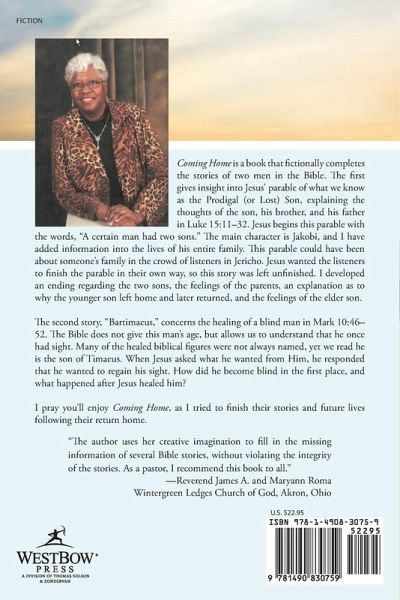Coming Home is a book that fictionally completes the stories of two men in the Bible. The first gives insight into Jesus' parable of what we know as the Prodigal (or Lost) Son, explaining the thoughts of the son, his brother, and his father in Luke 15:11-32. Jesus begins this parable with the words, "A certain man had two sons." The main character is Jakobi, and I have added information into the lives of his entire family. This parable could have been about someone's family in the crowd of listeners in Jericho. Jesus wanted the listeners to finish the parable in their own way, so this story was left unfinished. I developed an ending regarding the two sons, the feelings of the parents, an explanation as to why the younger son left home and later returned, and the feelings of the elder son. The second story, "Bartimaeus," concerns the healing of a blind man in Mark 10:46-52. The Bible does not give this man's age, but allows us to understand that he once had sight. Many of the healed biblical figures were not always named, yet we read he is the son of Timaeus. When Jesus asked what he wanted from Him, he responded that he wanted to regain his sight. How did he become blind in the first place, and what happened after Jesus healed him? I pray you'll enjoy Coming Home, as I tried to finish their stories and future lives following their return home. "The author uses her creative imagination to fill in the missing information of several Bible stories, without violating the integrity of the stories. As a pastor, I recommend this book to all." -Reverend James A. and Maryann Roma Wintergreen Ledges Church of God, Akron, Ohio