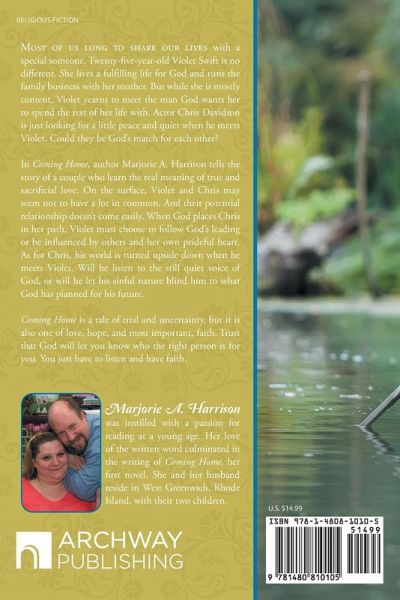 Most of us long to share our lives with a special someone. Twenty-five-year-old Violet Swift is no different. She lives a fulfilling life for God and runs the family business with her mother. But while she is mostly content, Violet yearns to meet the man God wants her to spend the rest of her life with. Actor Chris Davidson is just looking for a little peace and quiet when he meets Violet. Could they be God’s match for each other? In Coming Home, author Marjorie A. Harrison tells the story of a couple who learn the real meaning of true and sacrificial love. On the surface, Violet and Chris may seem not to have a lot in common. And their potential relationship doesn’t come easily. When God places Chris in her path, Violet must choose to follow God’s leading or be influenced by others and her own prideful heart. As for Chris, his world is turned upside down when he meets Violet. Will he listen to the still quiet voice of God, or will he let his sinful nature blind him to what God has planned for his future. Coming Home is a tale of trial and uncertainty, but it is also one of love, hope, and most important, faith. Trust that God will let you know who the right person is for you. You just have to listen and have faith.