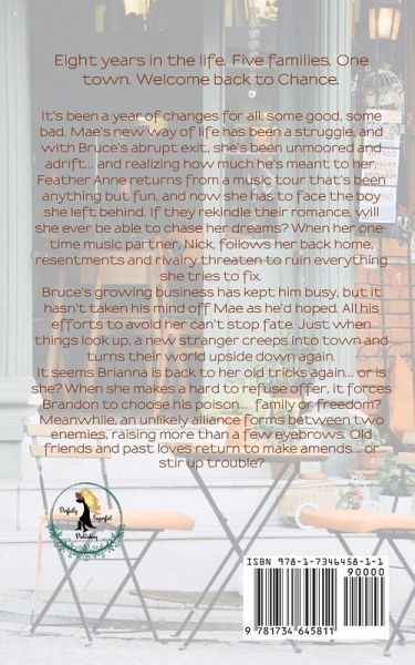 Eight years in the life. Five families. One town. Welcome back to Chance. It's been a year of changes for all; some good, some bad. Mae's new way of life has been a struggle, and with Bruce's abrupt exit, she's been unmoored and adrift... and realizing how much he's meant to her. Feather Anne returns from a music tour that's been anything but fun, and now she has to face the boy she left behind. If they rekindle their romance, will she ever be able to chase her dreams? When her one-time music partner, Nick, follows her back home, resentments and rivalry threaten to ruin everything she tries to fix. Bruce's growing business has kept him busy, but it hasn't taken his mind off Mae as he'd hoped. All his efforts to avoid her can't stop fate. Just when things look up, a new stranger creeps into town and turns their world upside down again. It seems Brianna is back to her old tricks again... or is she? When she makes a hard to refuse offer, it forces Brandon to choose his poison... family or freedom? Meanwhile, an unlikely alliance forms between two enemies, raising more than a few eyebrows. Old friends and past loves return to make amends... or stir up trouble?