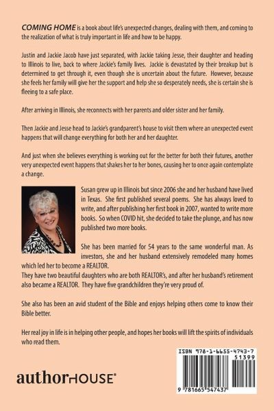 Coming Home is a book about life's unexpected changes, dealing with them, and coming to the realization of what is truly important in life and how to be happy. Justin and Jackie Jacob have just separated, with Jackie taking Jesse, their daughter and heading to Illinois to live, back to where Jackie's family lives. Jackie is devastated by their breakup but is determined to get through it, even though she is uncertain about the future. However, because she feels her family will give her the support and help she so desperately needs, she is certain she is fleeing to a safe place. After arriving in Illinois, she reconnects with her parents and older sister and her family. Then Jackie and Jesse head to Jackie's grandparent's house to visit them where an unexpected event happens that will change everything for both her and her daughter. And just when she believes everything is working out for the better for both their futures, another very unexpected event happens that shakes her to her bones, causing her to once again contemplate a change.