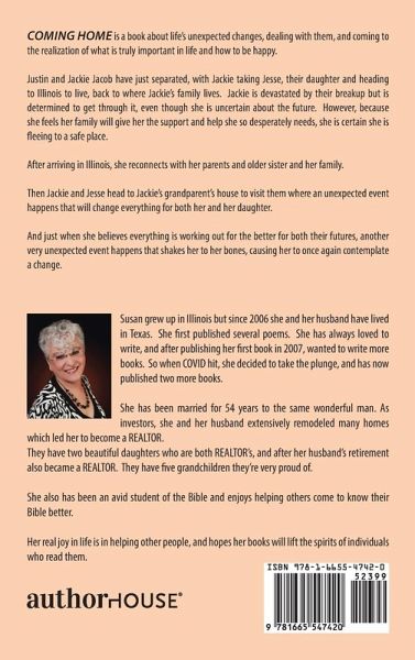 Coming Home is a book about life's unexpected changes, dealing with them, and coming to the realization of what is truly important in life and how to be happy. Justin and Jackie Jacob have just separated, with Jackie taking Jesse, their daughter and heading to Illinois to live, back to where Jackie's family lives. Jackie is devastated by their breakup but is determined to get through it, even though she is uncertain about the future. However, because she feels her family will give her the support and help she so desperately needs, she is certain she is fleeing to a safe place. After arriving in Illinois, she reconnects with her parents and older sister and her family. Then Jackie and Jesse head to Jackie's grandparent's house to visit them where an unexpected event happens that will change everything for both her and her daughter. And just when she believes everything is working out for the better for both their futures, another very unexpected event happens that shakes her to her bones, causing her to once again contemplate a change.
