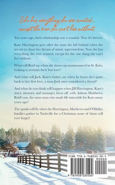 She has everything she ever wanted-except the man she can't live without. Ten years ago, their relationship was a scandal. Now it's forever. Kate Harrington goes after the man she left behind when she set out to chase her dream of music superstardom. Now she has everything she ever wanted, except for the one thing she can't live without. What will Reid say when she shows up unannounced in St. Kitts, looking to reclaim their lost love? And what will Jack, Kate's father, say when he hears she's gone back to her first love, a man Jack once considered a friend? And what do you think will happen when Jill Harrington, Kate's sister, attorney and manager, faces off with Ashton Matthews, Reid's son, the same man who made life miserable for Kate many years ago? The sparks will fly when the Harrington, Matthews and O'Malley families gather in Nashville for a Christmas none of them will ever forget!