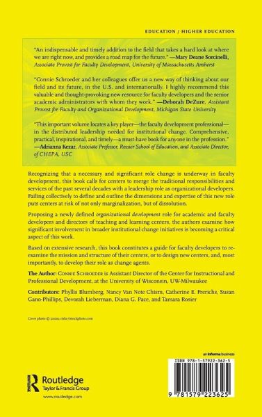 Introduction Part One. Calling Faculty Development to Reenvision its Role 1. Faculty Developers as Institutional Developers. The Missing Prong of Organizational Development-Connie Schroeder 2. Getting to the Table. Planning and Developing Institutional Initiatives-Nancy Van Note Chism 3. Nurturing Institutional Change. Collaboration and Leadership between Upper-Level Administrators and Faculty Developers-Devorah Lieberman Part Two. Examining the Evidence of an Organizational Development Role 4. Investigating Institutional Involvement and Change Agency-Connie Schroeder 5. Identifying the Factors that Enable an Organizational Development Role-Connie Schroeder Part Three. Repositioning Centers and Directors on the Institutional Radar Screen 6. Leading From the Middle. A Faculty Development Center at the Heart of Institutional Change-Catherine E. Frerichs, Diana G. Pace, and Tamara Rosier 7. Informing and Directing the Planning of Institutional Priorities and Initiatives-Phyllis Blumberg 8. Developing and Acting on a Center Vision Case Study Narratives-Connie Schroeder 9. Knowing and Facilitating Organizational Change Processes-Connie Schroeder 10. Optimizing Center Staffing and Advisory Boards to Promote Involvement in Institutional Change-Susan Gano-Phillips 11. Aligning and Revising Center Mission Statements-Connie Schroeder 12. Embedding Centers in Institutional Strategic Planning-Connie Schroeder Part Four. Next Steps 13. Recentering within the Web of Institutional Leadership-Connie Schroeder