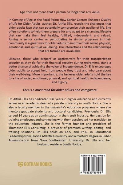 Age does not mean that a person no longer has any value. In Coming of Age at the Focal Point: How Senior Centers Enhance Quality of Life for Older Adults, author, Dr. Althia Ellis, reveals the challenges that older adults face that can potentially compromise their quality of life. She offers solutions to help them prepare for and adapt to a changing lifestyle that can make them feel healthy, fulfilled, independent, and valued. Joining a senior center or participating in similar programs in their community is a great way for older adults to improve their social, physical, emotional, and spiritual well-being. The interactions and the relationships that are formed are invaluable. Likewise, those who prepare as aggressively for their transportation security as they do for their financial security during retirement, stand a better chance of achieving the value of independence. Dr. Ellis encourages older adults to accept help from people they trust and who care about their well-being. More importantly, she believes older adults hold the key to a life of social, emotional, physical, and spiritual health; independence; and dignity. This is a must read for older adults and caregivers!