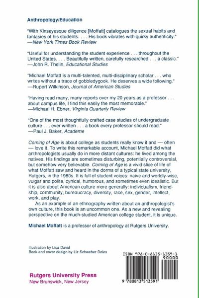 "With Kinseyesque diligence [Moffatt] catalogues the sexual habits and fantasies of his students. . . . His book vibrates with quirky authenticity." --New York Times Book Review "Useful for understanding the student experience . . . throughout the United States. . . . Beautifully written, carefully researched . . . a classic."--John Thelin, Educational Studies "Michael Moffatt is a multitalented, multidisciplinary scholar . . . who writes without a trace of gobbledygook. He deserves a wide following." --Rupert Wilkinson, Journal of American Studies "One of the most thoughtfully crafted case studies of undergraduate culture . . . ever written . . . a book every professor should read." --Paul J. Baker, Academe Coming of Age is about college as students really know it and--often--love it. To write this remarkable account, Michael Moffatt did what anthropologists usually do in more distant cultures: he lived among the natives. His findings are sometimes disturbing, potentially controversial, but somehow very believable. Coming of Age is a vivid slice of life of what Moffatt saw and heard in the dorms of a typical state university, Rutgers, in the 1980s. It is full of student voices: naive and worldy-wise, vulgar and polite, cynical, humorous, and sometimes even idealistic. But it is also about American culture more generally: individualism, friendship, community, bureaucracy, diversity, race, sex, gender, intellect, work, and play. As an example of an ethnography written about an anthropologist's own culture, this book is an uncommon one. As a new and revealing perspective on the much-studied American college student, it is unique.