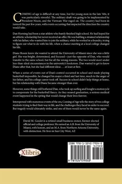 Coming of age is difficult at any time but for young men in the late '60's it was particularly stressful. The military draft was going to be implemented by President Nixon while the Vietnam War raged on. The country had been in turmoil the past few years with events occurring that impacted the direction the country, and its youth, would take. Dan Horning had been a star athlete in high school and hoped for an athletic scholarship to college. He was battling a strained relationship with his father, who wanted him to join the military, while he worked in a foundry. But a chance meeting at a local college would soon set him on a new path. Diane Rosen knew she wanted to attend the University of Miami since she was a little girl. She was bright, determined and focused. Just the opposite of Dan who would transfer to the same school. The two would meet by accident under less than ideal circumstances. Dan hoped to get to know Diane after their encounter but she felt very differently about him. When a series of events occurred at the university, out of Dan's control, that made playing basketball impossible, he changed his major, much to the frustration of his father, and his college career took off. Success in school didn't help Dan at home but things were changing with Diane. But things still bothered Dan so he took up surfing and bought a motorcycle to replace the basketball fiasco. A serious medical event would happen affecting both Dan and Diane, as they neared graduation, and would change their lives forever. Interspersed with numerous current events of that tumultuous era, Coming of Age tells the story of two college students trying to find their way, and the challenges they faced individually, and together, wanting to succeed. But tragedy would ultimately strike and one of them would never be the same.