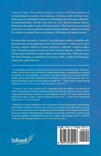 COMING OF AGE: OVERCOMING TRAUMA TO ACHIEVE SELF-DETERMINATION By Elaine Alec (te¿k¿nitk¿) What if coming of age wasn't about age at all-but about remembering who you are? In this powerful blend of memoir, Indigenous wisdom, and healing framework, author and community leader Elaine Alec shares her journey of overcoming addiction, shame, and generational trauma to reclaim her identity and voice. Through personal stories, cultural teachings, and practical tools from her Cultivating Safe Spaces framework, this book offers a pathway to emotional healing, self-determination, and reconnection. This is not just a story of survival-it's a call to remember your humanness, to break generational cycles, and to step into your purpose with clarity and courage. Grounded in the lived experiences of a syilx and secwepemc woman, Coming of Age is for anyone seeking to heal from trauma, embrace their identity, and transform how they relate to themselves and the world around them. Perfect for readers of self-help, trauma recovery, Indigenous leadership, and personal growth. Keywords: self-determination; trauma recovery; Indigenous wisdom; emotional healing; personal growth; Cultivating Safe Spaces; decolonization; breaking generational cycles; memoir and guide; healing from colonialism