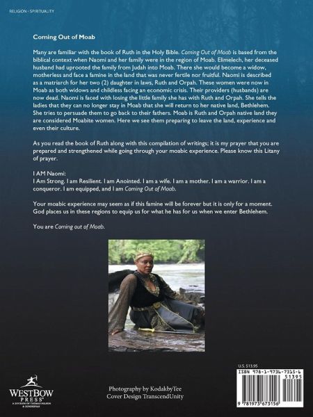 Coming Out of Moab Many are familiar with the book of Ruth in the Holy Bible. Coming Out of Moab is based from the biblical context when Naomi and her family were in the region of Moab. Elimelech, her deceased husband had uprooted the family from Judah into Moab. There she would become a widow, motherless and face a famine in the land that was never fertile nor fruitful. Naomi is described as a matriarch for her two (2) daughter in laws, Ruth and Orpah. These women were now in Moab as both widows and childless facing an economic crisis. Their providers (husbands) are now dead. Naomi is faced with losing the little family she has with Ruth and Orpah. She tells the ladies that they can no longer stay in Moab that she will return to her native land, Bethlehem. She tries to persuade them to go back to their fathers. Moab is Ruth and Orpah native land they are considered Moabite women. Here we see them preparing to leave the land, experience and even their culture. As you read the book of Ruth along with this compilation of writings; it is my prayer that you are prepared and strengthened while going through your moabic experience. Please know this Litany of prayer. I AM Naomi: I Am Strong. I am Resilient. I am Anointed. I am a wife. I am a mother. I am a warrior. I am a conqueror. I am equipped, and I am Coming Out of Moab. Your moabic experience may seem as if this famine will be forever but it is only for a moment. God places us in these regions to equip us for what he has for us when we enter Bethlehem. You are Coming out of Moab.