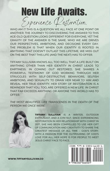 New Life Awaits! Experience Restoration. Who am I? This is a question we all face at one point or another. The journey to discovering the answer to this age-old question looks different for everyone, yet the gravity of the answer is the same. Who we are drives our perspectives, ambitions, and decisions every day. The problem is when our identity is rooted in anything that doesn't outlast this lifetime, we miss out on the best that this life (and the next) has to offer. Tiffany Sullivan knows all too well that a life built on anything other than her identity in Christ leads to emptiness. In Coming Out Restored, she shares a powerful testimony of God working through her struggles with self-destructive behaviors, selfish ambitions, and sexuality to draw her near to him and reveal her true identity. Her story of restoration is a reminder that you, too, are offered a new life in Christ that far exceeds anything or anyone this world has to offer. The most beautiful life transcends in the death of the person we once were.