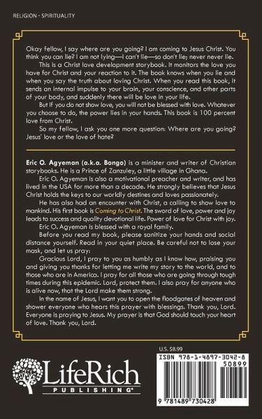 Eric O. Agyeman (a.k.a. Bongo) is a minister and writer of Christian storybooks. He is a Prince of Zanzuley, a little village in Ghana. Eric O. Agyeman is also a motivational preacher and writer, and has lived in the USA for more than a decade. He strongly believes that Jesus Christ holds the keys to our worldly destines and loves passionately. He has also had an encounter with Christ, a calling to show love to mankind. His first book is Coming to Christ. The sword of love, power and joy leads to success and quality devotional life. Power of love for Christ with joy. Eric O. Agyeman is blessed with a royal family. Before you read my book, please sanitize your hands and social distance yourself. Read in your quiet place. Be careful not to lose your mask, and let us pray: Gracious Lord, I pray to you as humbly as I know how, praising you and giving you thanks for letting me write my story to the world, and to those who are in America. I pray for all those who are going through tough times during this epidemic. Lord, protect them. I also pray for anyone who is alive now, that the Lord make them strong. In the name of Jesus, I want you to open the floodgates of heaven and shower everyone who hears this prayer with blessings. Thank you, Lord. Everyone is praying to Jesus. My prayer is that God should touch your heart of love. Thank you, Lord.