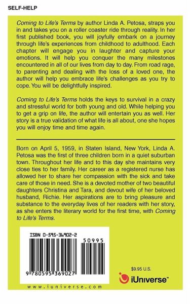 Coming to Life's Terms by author Linda Petosa, straps you in and takes you on a roller coaster ride through reality. In her first published book, you will joyfully embark on a journey through life's experiences from childhood to adulthood. Each chapter will engage you in laughter and capture your emotions. It will help you conquer the many milestones encountered in all of our lives from day to day. From road rage, to parenting and dealing with the loss of a loved one, the author will help you embrace life's challenges as you try to cope. You will be delightfully inspired. Coming to Life's Terms holds the keys to survival in a crazy and stressful world for both young and old. While helping you to get a grip on life, the author will entertain you as well. Her story is a true validation of what life is all about, one she hopes you will enjoy time and time again.