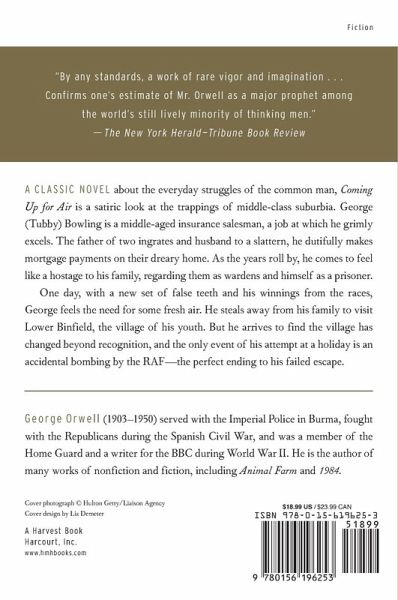 From George Orwell, the author of 1984 and Animal Farm, Coming Up for Air is the classic, comic novel about the everyday struggles of the common man and a satiric look at the trappings of middle-class suburbia. George "Tubby" Bowling is a middle-aged insurance salesman, a job at which he grimly excels, dutifully paying the mortgage on an average English suburban row house, and supporting an ungrateful family. As the years roll by, he comes to feel like a hostage to his wife and children, regarding them as wardens and himself as a prisoner. One day, after winning some money from a bet at the races, George steals away from his family to visit the village where he grew up, to fish for carp in a pool he remembers from thirty years before. The pool, alas, is gone, the village has changed beyond recognition, and the principal event of his holiday is an accidental bombing by the RAF?the perfect ending to his failed escape. "A work of rare vigor and imagination."?New York Herald-Tribune Book Review