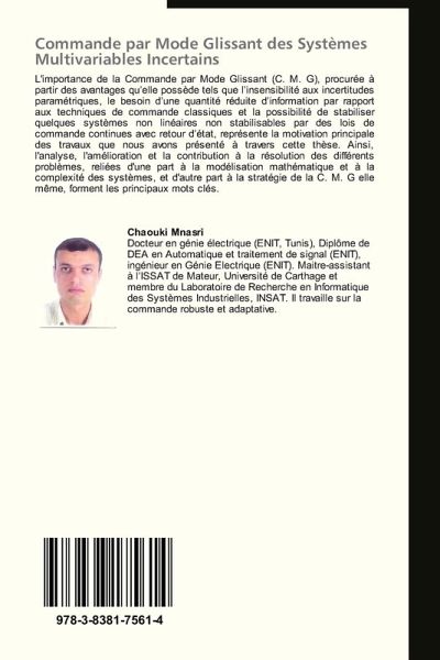 L'importance de la Commande par Mode Glissant (C. M. G), procurée à partir des avantages qu elle possède tels que l insensibilité aux incertitudes paramétriques, le besoin d une quantité réduite d information par rapport aux techniques de commande classiques et la possibilité de stabiliser quelques systèmes non linéaires non stabilisables par des lois de commande continues avec retour d état, représente la motivation principale des travaux que nous avons présenté à travers cette thèse. Ainsi, l'analyse, l'amélioration et la contribution à la résolution des différents problèmes, reliées d'une part à la modélisation mathématique et à la complexité des systèmes, et d'autre part à la stratégie de la C. M. G elle même, forment les principaux mots clés.