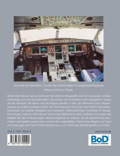 Die vierte Jet-Generation: Cockpit des viermotorigen LH-LangstreckenflugzeugsAirbus A 340 für 2 Piloten.Taktile Informationen gibt es nicht mehr. Die seitlichen Steuergriffe sind nicht verbunden, arbeiten unabhängig und ohne Drucksimulation. Sie werden vom Autopiloten nicht nachgeführt, ebenso wie die Gashebel. Mit diesen wird ein Regime gewählt, in dem die Triebwerke ohne Hebelbewegung automatisch geregelt werden. Die Trimmung läuft ohne Zutun des Piloten automatisch. Horizontale und vertikale Navigation sind verbessert, Wetterradar-Daten erscheinen im Navigations-Display. Optische Informationen sind auf den Bildschirmen stark verdichtet und wegen des Wegfalls fast aller Analoganzeigen teilweise langsamer zu erfassen. Da der gesamte Flug automatisch durchgeführt werden kann, kommt dem regelmäßigen Training des Fliegens von Hand und Landungen nach Sicht erhöhte Bedeutung zu, um notwendige Basisfähigkeiten zu erhalten.