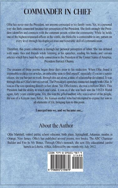 Ollie has never met the President, nor anyone connected to his family roots. Yet, in a personal way she feels connected because her perception of the President. She feels strongly the President identifies and connects with the common person within the community. While he holds one of the highest respected offices in the world, she thinks he is connectable to any person on every level through his displayed trust and honorable skill of communication. Therefore, this poem collection is through her personal perception of labor. She has debated with many foes and friends while listening to his speeches, reading his books and various articles which have been her only connection to the President of the United States of America, President Barrack Obama. The creation of these poems began three days prior to his reelection. When Ollie found it impossible to sleep rest or relax, an unhealthy state to find oneself, especially if you are a senior citizen; she put her pen to work, through this act alone, a state of relationship developed. It was through this act Ollie's nerves curved. The President's speeches connected deeply with Ollie. It was as if he was speaking directly to her, alone. Yet, Ollie knows, she was a million Ollie's. This President had the ability to touch one's soul. It was as if she was back into the VISTA World again, forty years yonder gone. Yes, this was the gifted auditor, who was a server of the people, the son of a Kenyan man, father; the Kansas mother who had attempted to expose her son to all elements of life, bringing him to this point. I merged into we, and we became one...
