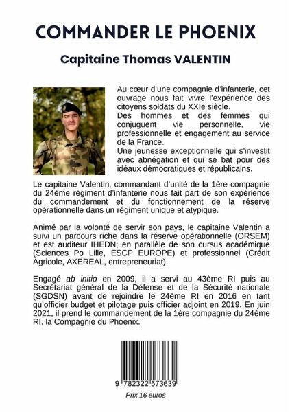 Au coeur d'une compagnie d'infanterie, cet ouvrage nous fait vivre l'expérience des citoyens soldats du XXIème siècle. Des hommes et des femmes qui conjuguent vie personnelle, vie professionnelle et engagement au service de la France. Une jeunesse exceptionnelle qui s'investit avec abnégation et qui se bat pour des idéaux démocratiques et républicains.