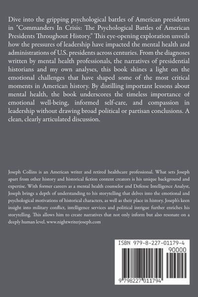 Dive into the gripping psychological battles of American presidents in "Commanders In Crisis: The Psychological Battles of American Presidents Throughout History." This eye-opening exploration unveils how the pressures of leadership have impacted the mental health and administrations of U.S. presidents across centuries. From the diagnoses written by mental health professionals, the narratives of presidential historians and my own analyses, this book shines a light on the emotional challenges that have shaped some of the most critical moments in American history. By distilling important lessons about mental health, the book underscores the timeless importance of emotional well-being, informed self-care, and compassion in leadership without drawing broad political or partisan conclusions. A clean, clearly articulated discussion at 104 pages in length.