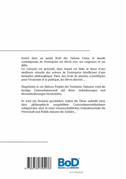 Inséré dans un projet fictif des Nations Unies, le monde contemporain de l'entreprise est décrit avec ses exigences et ses défis. Un scénario est présenté, dans lequel est bâtie la these d'une meilleure réussite des acteurs de l'entreprise bénéficiant d'une formation philosophique. Dans une école de pensées scientifiques pour l'économie et la politique, les élèves doivent ...Eingebettet in ein fiktives Projekt der Vereinten Nationen wird die heutige Unternehmenswelt mit ihren Anforderungen und Herausforderungen beschrieben. Es wird ein Szenario geschildert, indem die These aufstellt wird, dass philosophisch ausgebildete Unternehmensteilnehmer erfolgreicher sind. In einer wissenschaftlichen Gedankenschule für Wirtschaft und Politik müssen die Schüler...